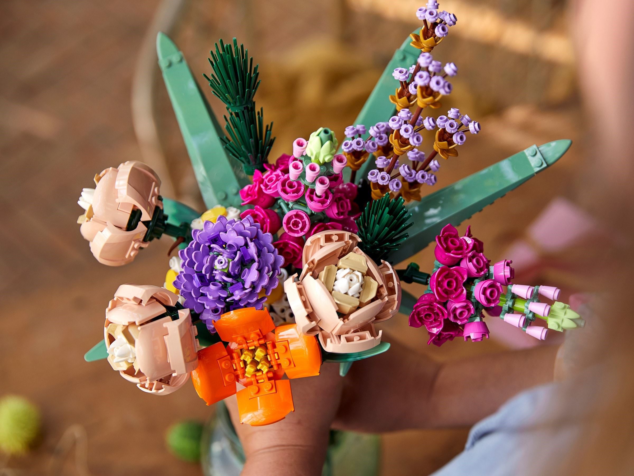When complete, the impressive flower display brings a touch of fun and colour to any room. The adjustable stems make it easy to tailor the arrangement for any vase or container. Style flowers like a pro Each detail of the bouquet is made from LEGO components – all customizable to create a unique display.